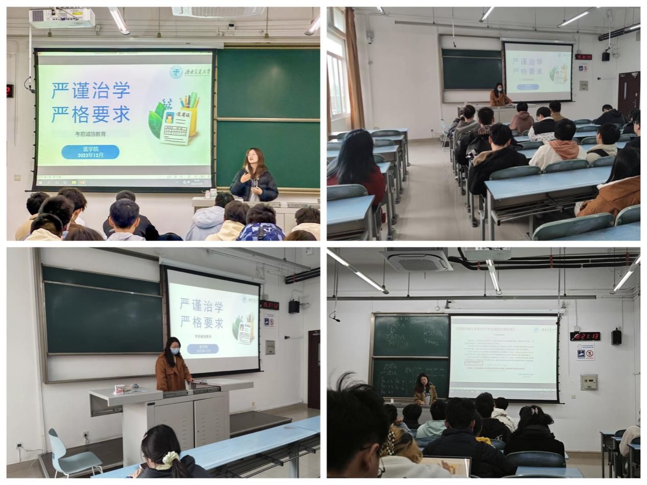 12月8日,2020级、2021级辅导员靳涵在各年级分别召开主题班会。在班会上,靳老师详细解读了诚信考试的定义及其深刻意义,介绍了学校相关的规定和相应的处罚措施。特别提醒即将要参加2023年考研的同学要端正态度,以诚信之心应考。2022级、2023级辅导员王川玲于12月10日和11日召开主题班会,她强调同学们在四六级考试和期末考试中要自觉遵守学校和国家的考试规范,养成良好的行为习惯和品德素质,并通过对比分析正反面典型事例加深了同学们对诚信考试重要性的认识。