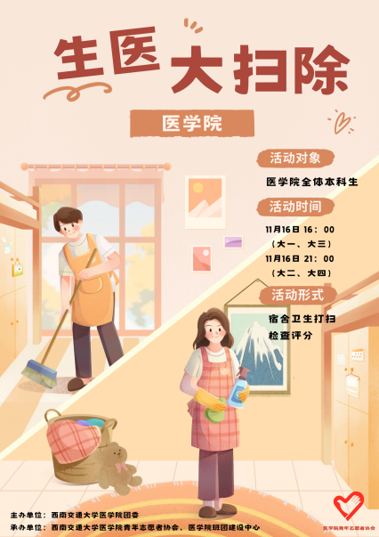 青年志愿者协会详细介绍了打扫寝室的重要意义及相关注意事项。此次寝室大扫除不仅有助于强化同学们的劳动意识,引导大家崇尚劳动,热爱劳动,尊重劳动;更有助于培养同学们的卫生习惯与集体观念,为同学们创造一个更为舒适的学习和生活环境。此外,“生医大扫除”活动将成为老澳门六合彩官网