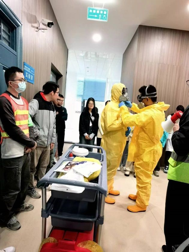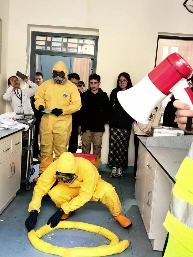 在工业中心C107实验室进行了化学品泄漏演练(浓盐酸遗洒&灼伤事件安全应急演练),参与演练的老师及同学们积极认真,上午还专门进行了预演练。