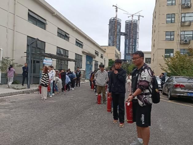 讲座结束后,全体同学在老师和志愿者的带领下来到工业中心内的空地进行消防演练。保卫处老师详细讲解了常见消防器材——干粉灭火器的使用方法,随后,同学、老师分组轮流进行灭火演练。