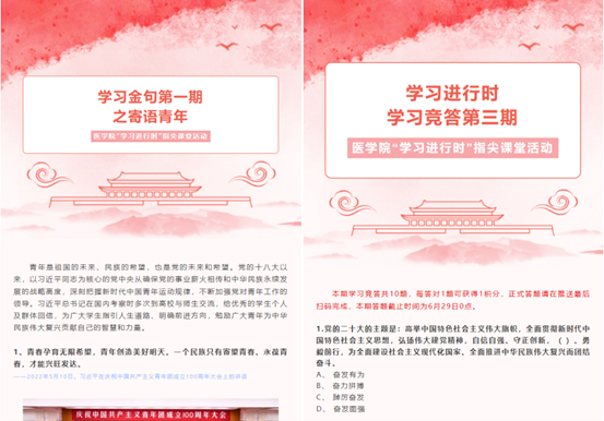 党委于“交大医学”微信公众号推出“学习进行时”指尖课堂活动,推送“学习金句”5期,“学习竞答”5期,“学习心得”1期,开展线下“金句三分钟”分享活动7次。