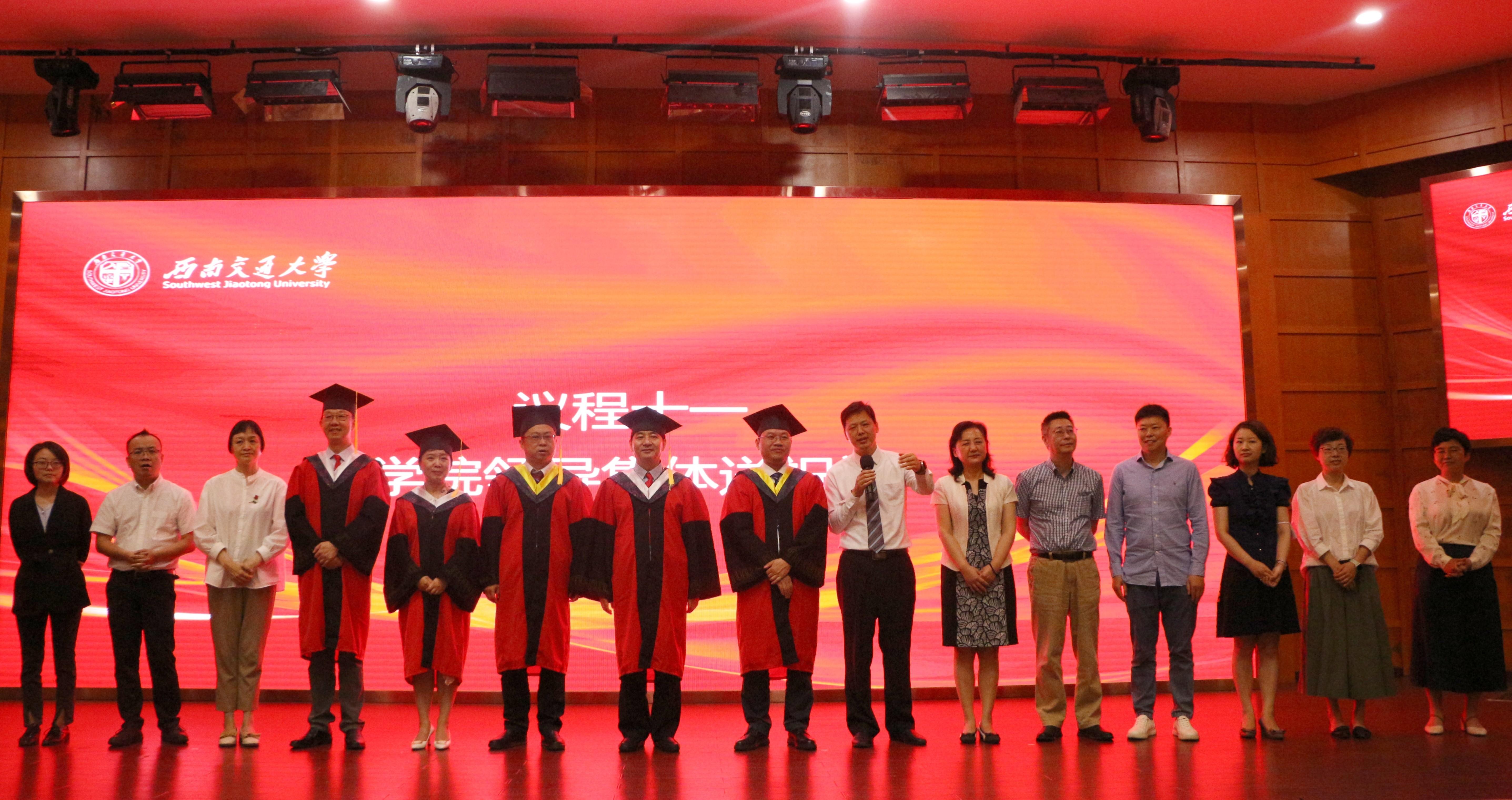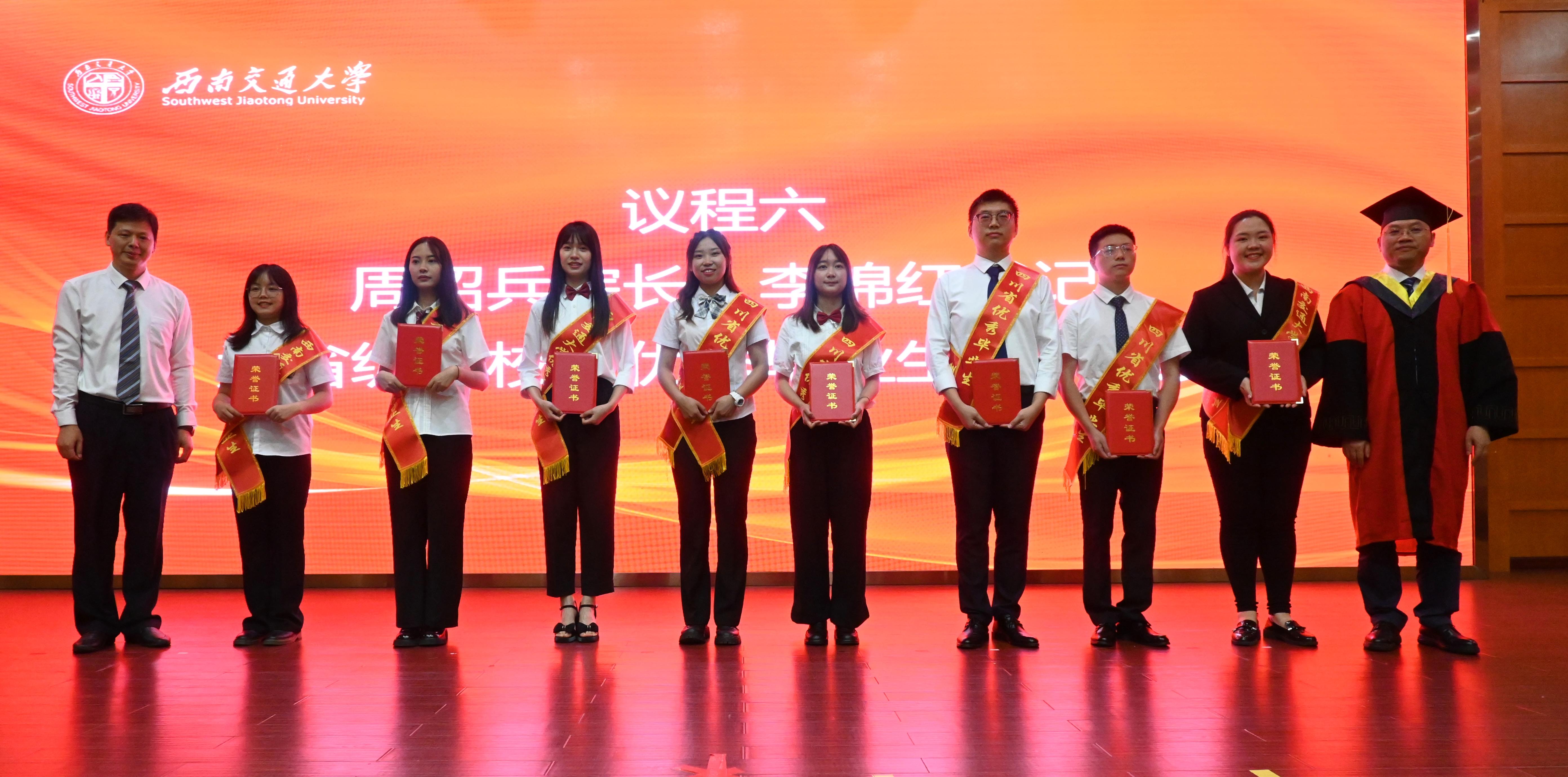 侯丁煜、梁月、于昕冉、赵一心、姚烨兰5名本科生,罗强、刘瑶、鲁欣、杨雪、喻谦、张婕鑫、张雪7名研究生“西南交通大学优秀毕业生”荣誉称号。李锦红书记向获表彰的毕业生及全体毕业生致以祝贺,希望广大毕业生坚定理想信念,继续秉承和发扬“竢实扬华,自强不息”的交大精神,脚踏实地、埋头苦干,肩负当代大学生的使命担当,续写新时代青年的奋斗征程。随后,周绍兵院长与李锦红书记共同为获得省级、校级优秀毕业生的同学们颁发了证书。