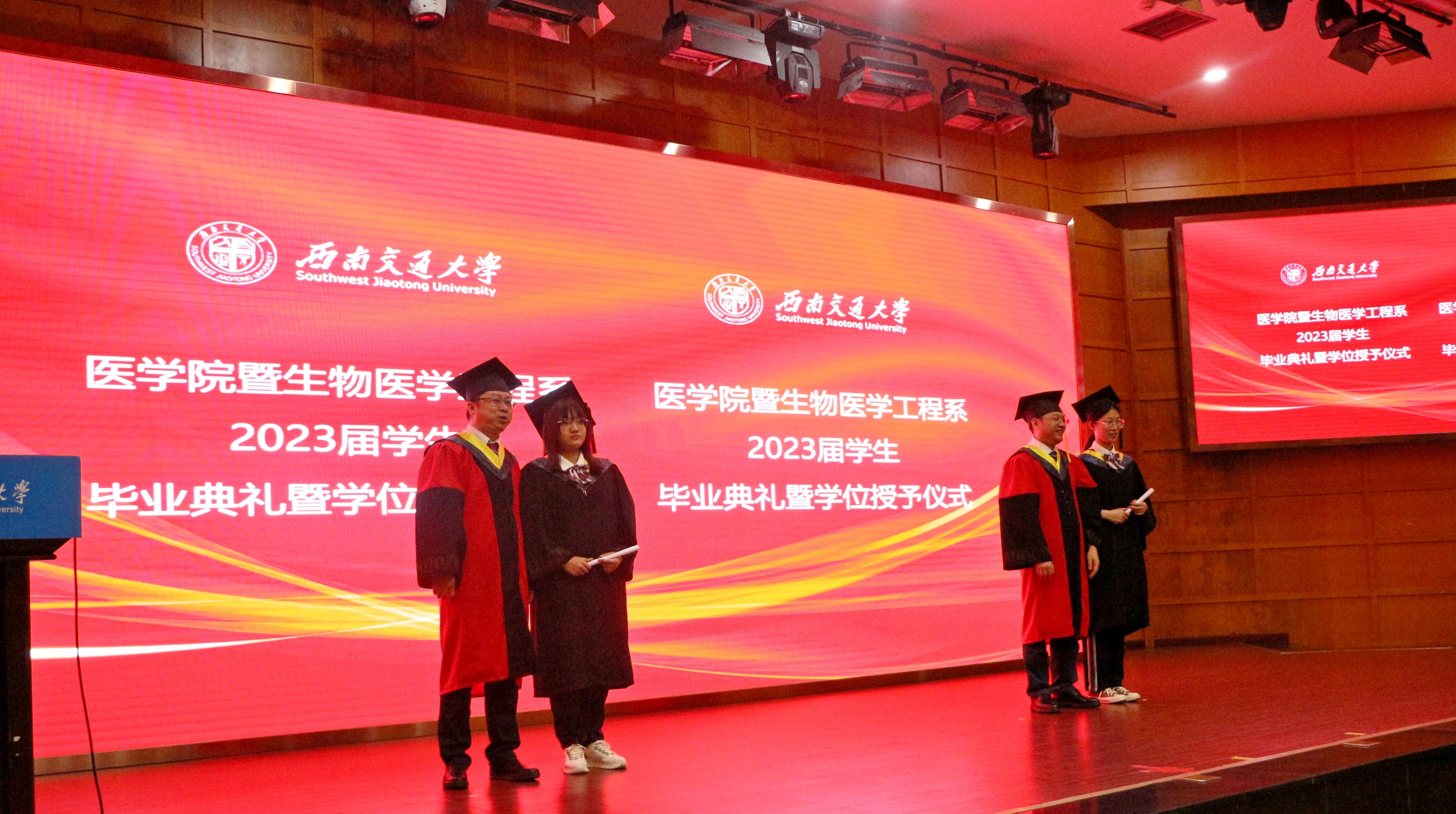 附属医院成都市第三人民医院导师刘汉雄、本科生张佳豪、研究生张雪,作为导师和毕业生代表发言。刘汉雄老师鼓励毕业生们继续扎根在医工结合的新兴领域,为祖国的卫生健康事业努力奋斗。张佳豪用“精勤求学、敦笃励志、果毅力行、忠恕任事”解读了一个交大学子的成长经历。张雪将一个凉山州山村中的女孩走进交大立志从医的心路历程娓娓道来。