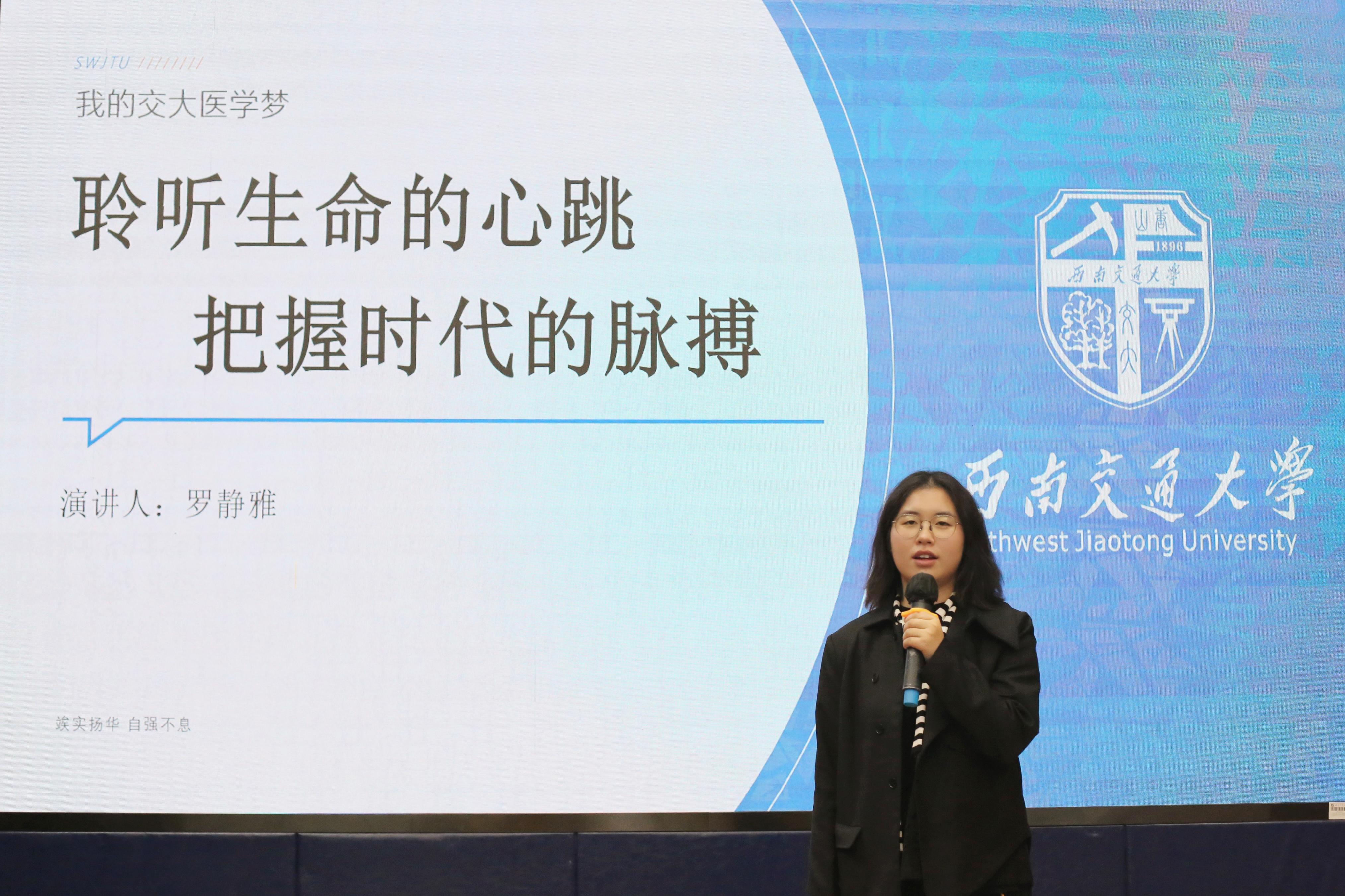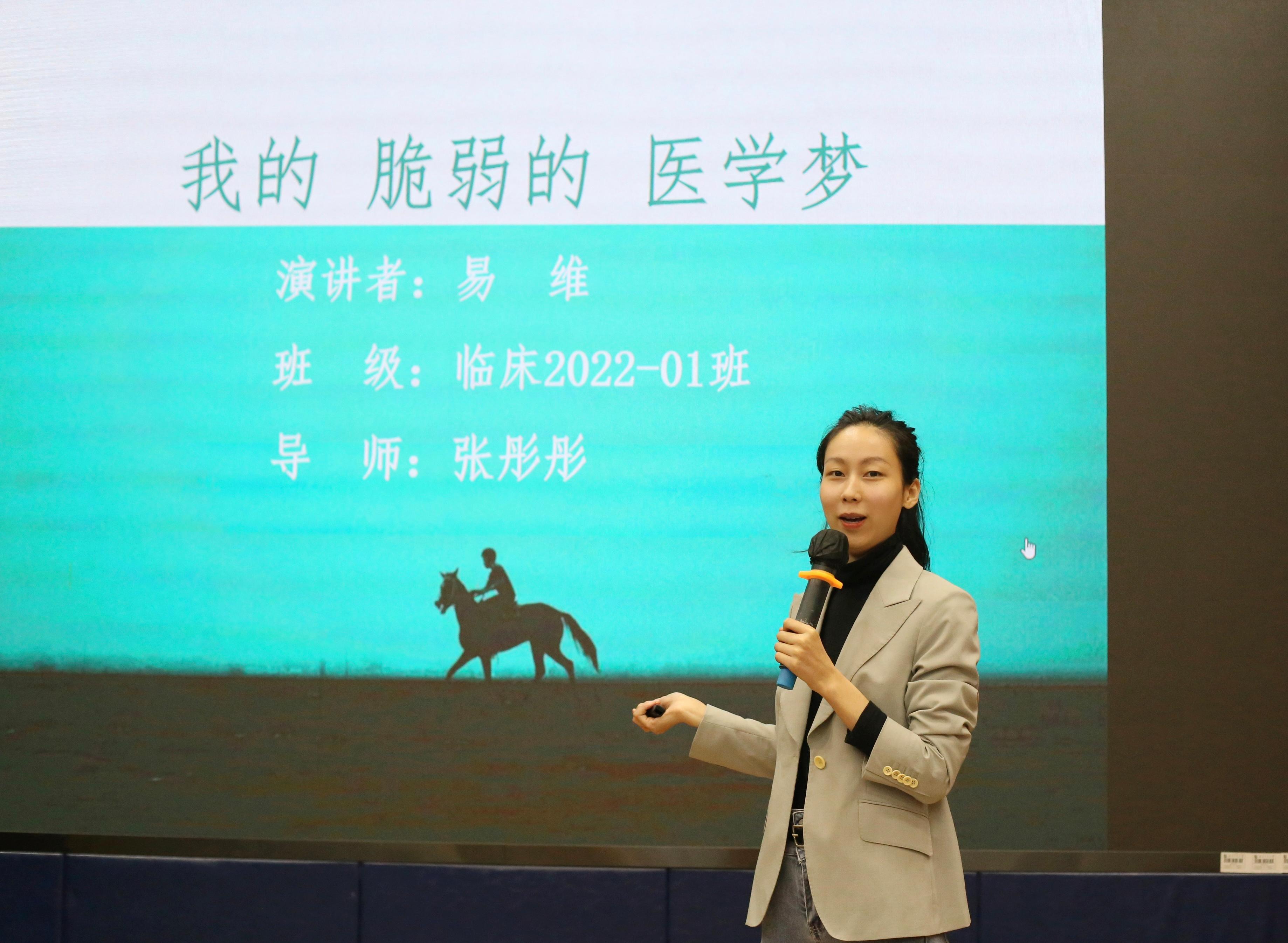 易维同学演讲的题目是“我的‘脆弱的’医学梦”,她以个人学医历程从迷茫到坚定的过程为线索,逐层递进地讲述了“一个人可能走得很快,但一群人才能走得更远”的道理,娓娓道来,引人深思。她讲到:“我的医学梦,个体的医学梦或许脆弱,但我们的医学梦必然坚强,伟大。”