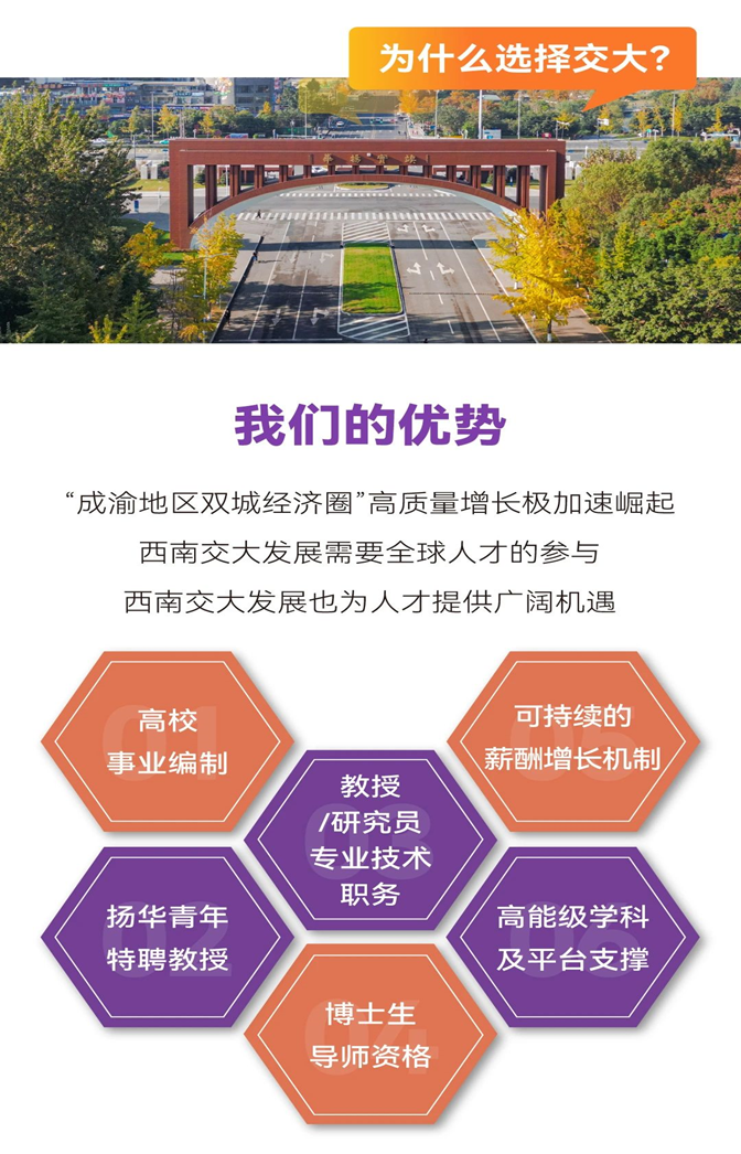 西南交通大学是教育部直属全国重点大学,国家首批“双一流”“211工程”“985工程优势学科创新平台”“2011协同创新计划”重点建设高校,设有研究生院。坐落于中国历史文化名城、国家中心城市、“成渝地区双城经济圈”核心城市——成都。