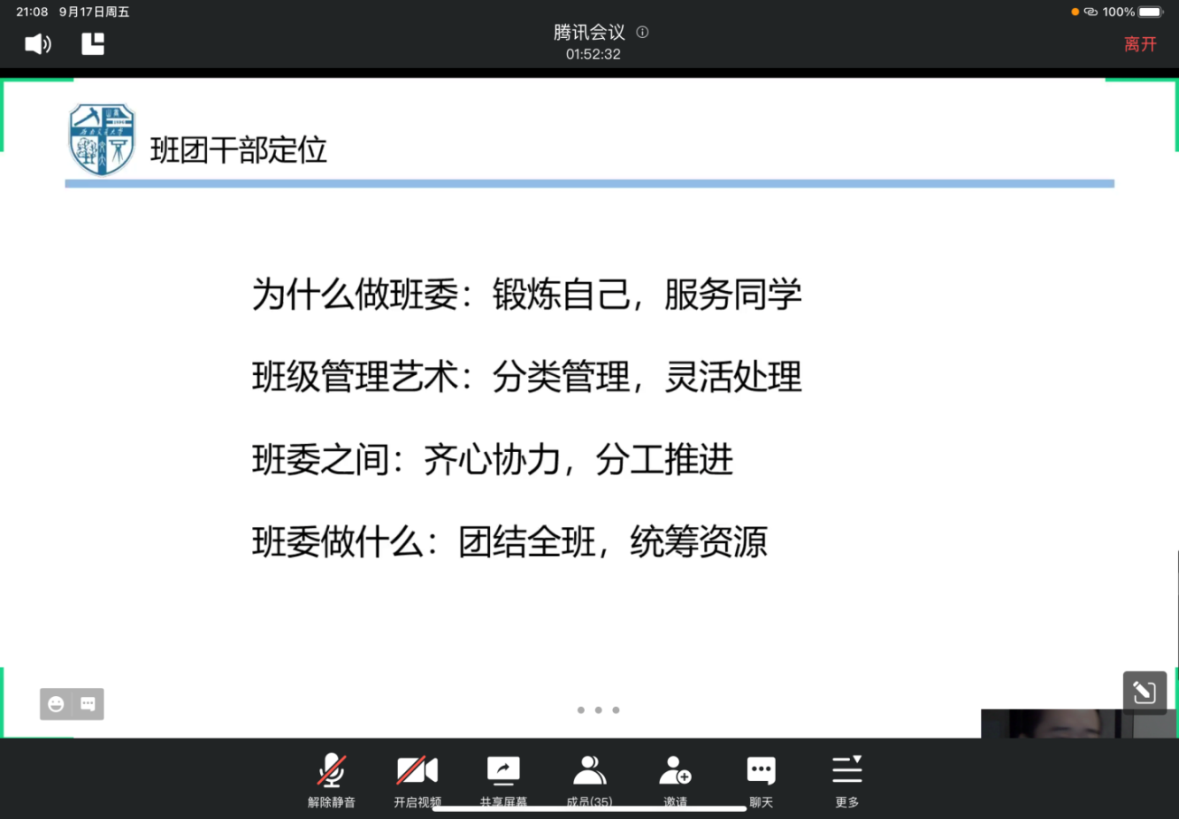 2021级新生入学教育之班团干部培训通过线上讲座方式开展,讲座由老澳门六合彩官网