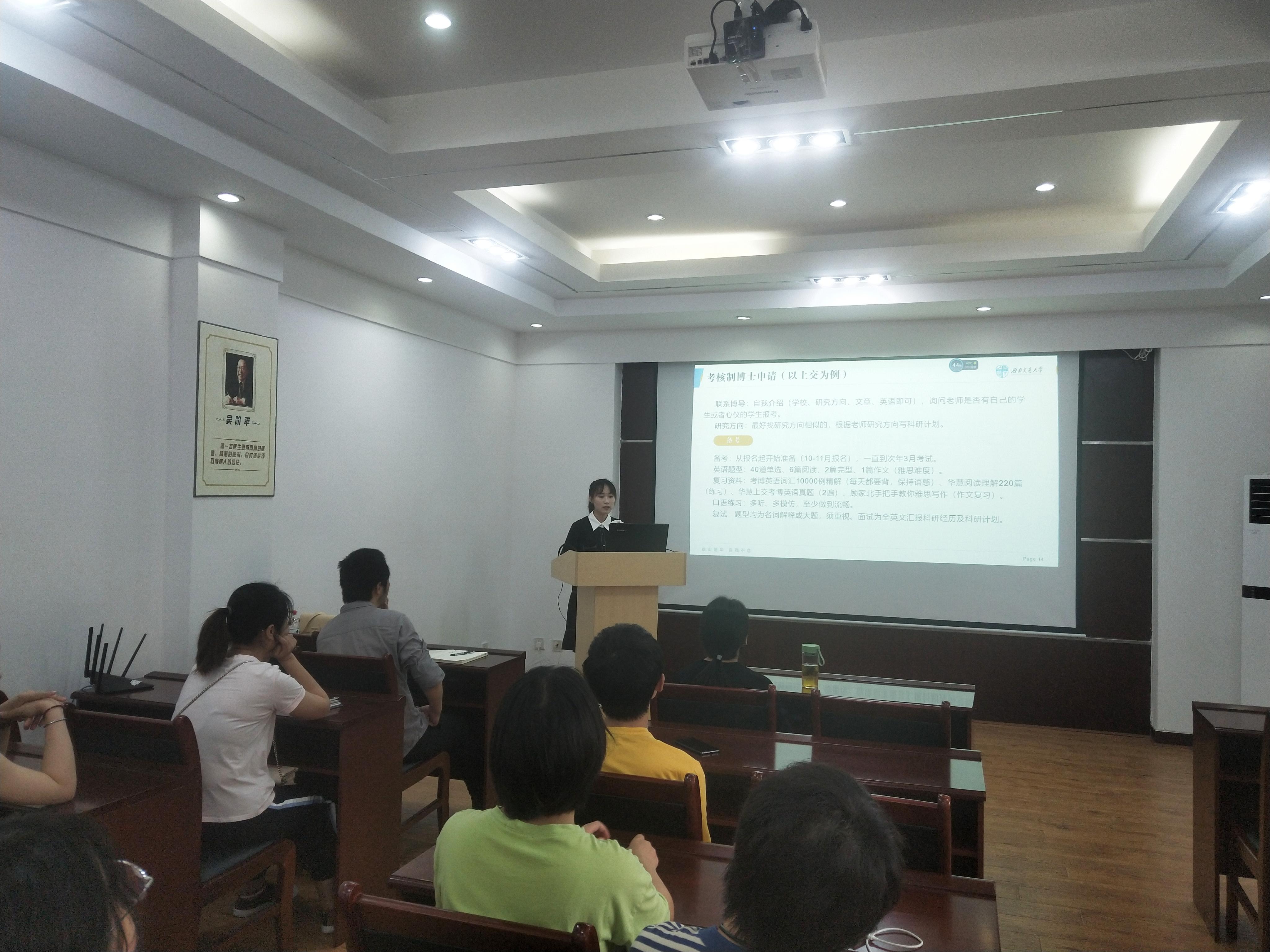 优秀毕业生,硕士期间发表文章多篇,参与多项四川省科技厅重点研发项目,获西南交通大学“优秀团干部”、“优秀毕业生”等荣誉称号,多次参与志愿者活动、“三下乡”支教活动等。陈杏主要从英语能力的强化、学术水平的提升、考核制博士的申请以及综合素质的拓展四个方面展开,并结合自身的成长经历与在场同学交流分享。