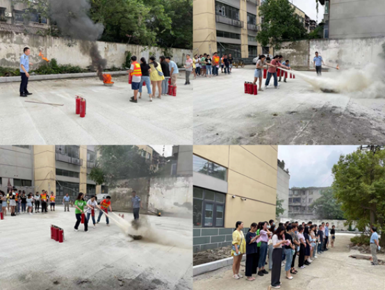师生进行消防灭火演练,参训人员五人一组练习使用灭火器扑灭火焰,在实践中掌握了灭火器材的使用。