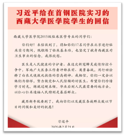 学生的回信。李锦红指出,总书记回信内涵深刻,意义重大:体现了党中央国务院对医学教育、卫生健康事业的高度重视、对医务工作者的亲切关怀;对医学生报效国家服务人民的殷切希望;对鼓舞在校医学生和逆行奋战在抗疫前线、救死扶伤的广大医护工作者,以及全面打赢疫情防控人民战争、总体战、阻击战具有重大意义。