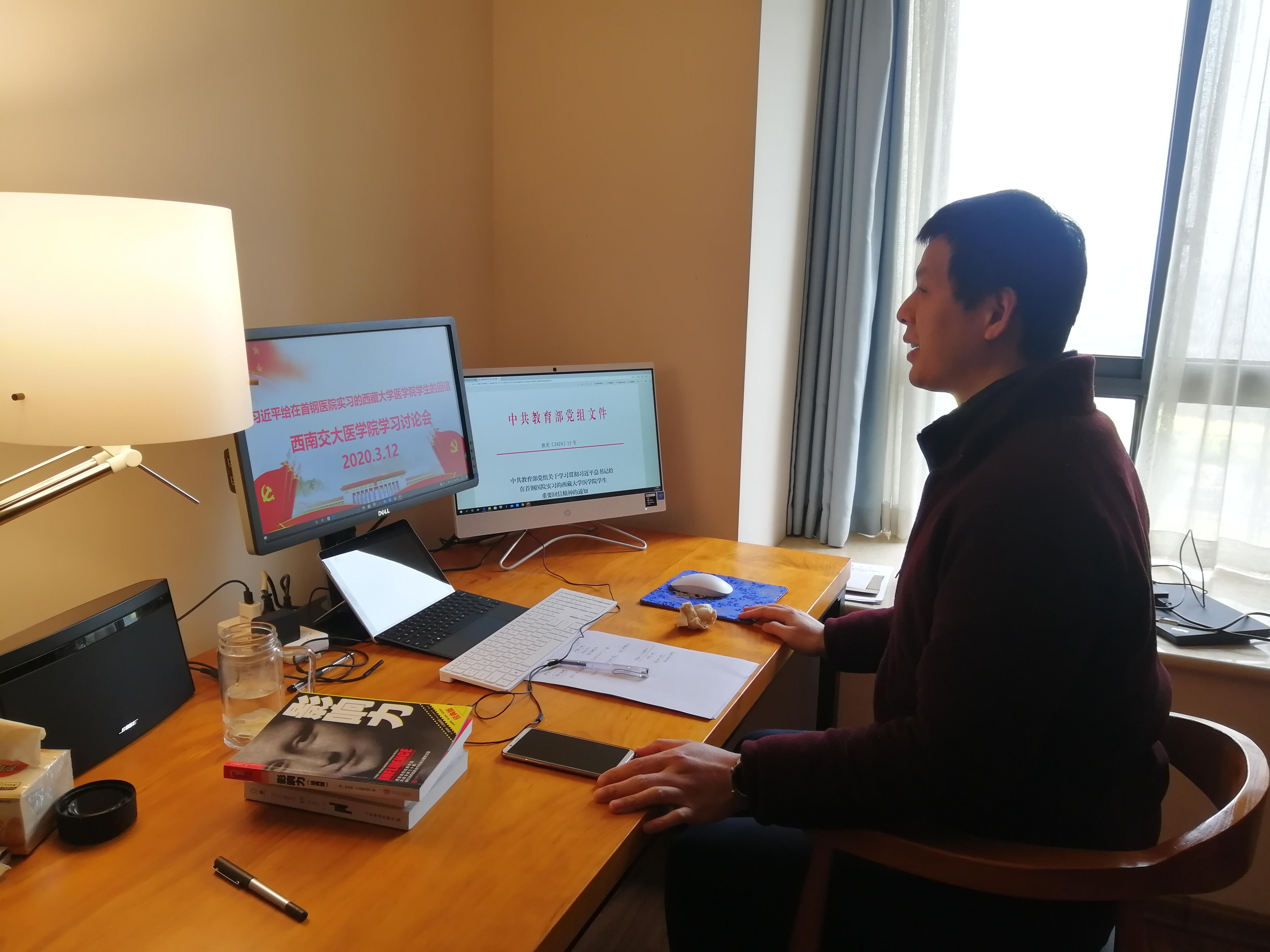 随后,党员们纷纷结合居家防疫和自身医学专业发表看法,进行交流与讨论。基础2017级王孝平将流感和新冠肺炎的死亡率进行对比,感慨幸而生在中国,同时表示医学研究生有愿望走上医疗一线,也一定有能力走上医学一线,并誓将成为抗疫前线老师们一样的医术精湛,医德高尚的医学人。临床2017级张淼谈及火神山和雷神山两所医院的建造速度,全国人民线上办公的方便性,表达了对中国力量和科技力量的敬佩之情。