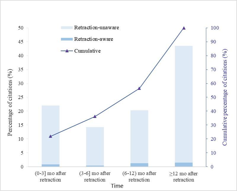 该研究聚焦于领域——microRNA生物标志物研究中被撤稿文章的后续引用。在生物医学研究中,microRNA生物标志物的使用变得越来越普遍,因为它们在疾病诊断和预后方面显示出了潜在的价值。然而,近年来,microRNA生物标志物相关研究成为了撤稿热点。撤稿是学术出版商用来阻止研究不当行为(剽窃/抄袭、捏造或伪造)和提醒读者注意期刊上发表的错误内容的一种手段。然而,如果已撤稿的文章仍然被引用为合法文章,那它们可能会继续损害科学。为了了解撤稿这种手段是否能有效阻止撤稿后引用,该研究对887篇已经撤回的microRNA生物标志物文章的引用情况进行了系统分析,研究发现这些被撤稿的文章在撤稿后仍然被引用了6327次,其中有238篇(占比30.05%)在撤稿后的引用次数甚至超过了撤稿前。撤稿论文被引用的趋势与期刊的影响因子无显著相关性,即使是影响因子较低的期刊中撤稿的论文,也可能在学术圈中持续产生负影响。此外,研究团队随机抽取了87篇(占9.81%)撤稿文章,发现这些文章在撤稿12个月以后,仍有超40%的引用。与1620篇非撤稿文章的对照组相比,撤稿并没有有效减少被撤稿论文组的引用;相反,414篇引用撤稿文章组与7954篇未引用撤稿文章的对照组相比,引用撤稿文章的研究将来更可能被撤稿。