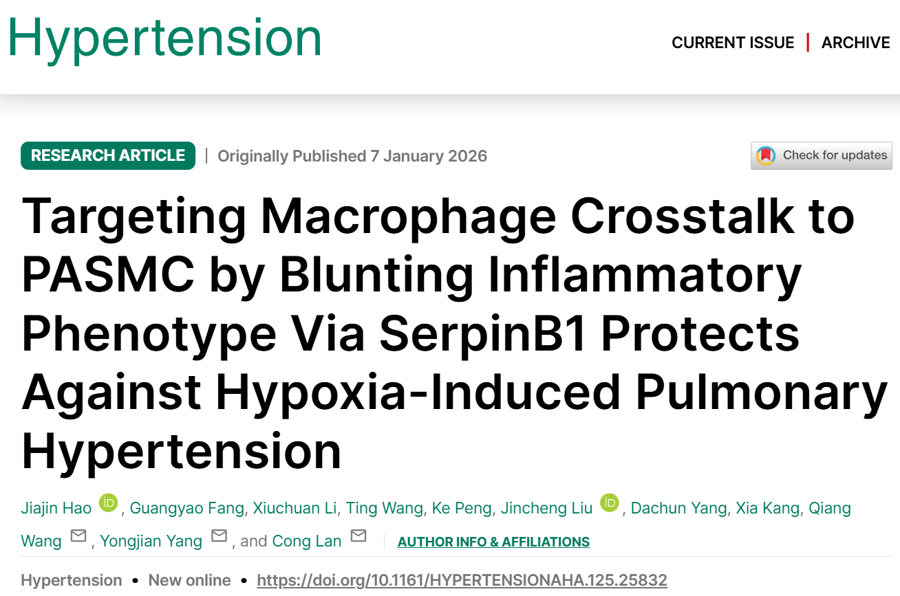 2023级在读硕士研究生郝佳瑾以第一作者在心血管领域权威期刊Hypertension(中科院1区TOP,影响因子8.2)发表了题为“Targeting macrophage crosstalk to PASMC by blunting inflammatory phenotype via SerpinB1 protects against hypoxia-induced pulmonary hypertension”的原创性论文。该研究首次揭示了巨噬细胞-肺动脉平滑肌细胞对话存在缺氧应答效应,并明确丝氨酸蛋白酶抑制剂B1(SerpinB1)下调是缺氧暴露诱导巨噬细胞炎症表型的关键机制,巨噬细胞SerpinB1过表达可有效阻断肺动脉周围巨噬细胞对肺动脉平滑肌细胞的“恶性对话”,减轻HPH。该研究为HPH的防治提供了新的理论支持和潜在治疗靶点。老澳门六合彩-老澳门六合彩官网