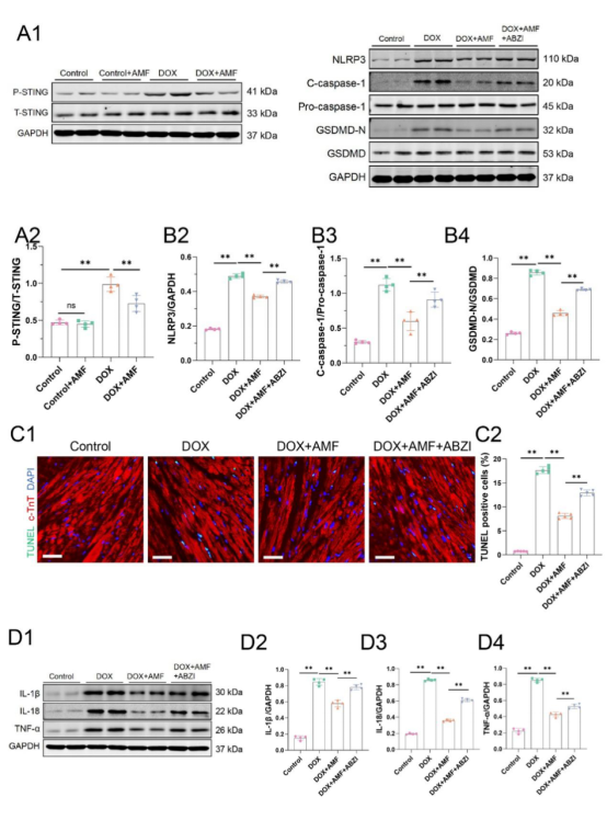 细胞焦亡的一个典型特征是GSDMD-N介导的细胞膜囊泡状结构形成,囊泡破裂,孔洞形成,导致细胞肿胀,细胞膜破裂,促炎因子如IL-1β、IL-18和TNF-α的释放,最终细胞焦亡。为验证这一点,作者提取原代心肌细胞进行体外培养,通过免疫荧光染色、扫描电镜等手段揭示了阿霉素诱导的心肌细胞焦亡,且AMF能抑制离体心肌细胞焦亡,而STING/NLRP3通路激活阻断了AMF的抗焦亡作用。