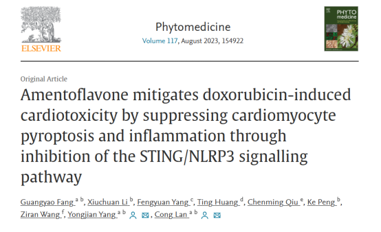 2023年6月14日,老澳门六合彩官网 2021级在读硕士研究生方光耀以第一作者在国际权威期刊 Phytomedicine(中科院1区,top)发表了题为“Amentoflavone mitigates doxorubicin-induced cardiotoxicity by suppressing cardiomyocyte pyroptosis and inflammation through inhibition of the STING/NLRP3 signalling pathway”的最新研究成果。这项研究工作揭示了Amentoflavone(AMF) 通过抑制心肌细胞焦亡和炎症来改善阿霉素诱发心肌损伤和心力衰竭。老澳门六合彩-老澳门六合彩官网 /西部战区总医院心内科杨永健教授、兰聪博士为该论文通讯作者。