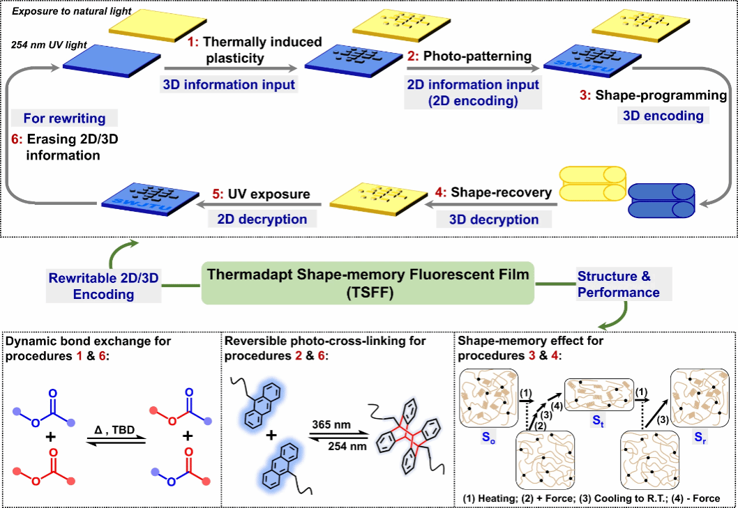 目前,荧光材料因其刺激响应变色特性而在信息防伪等领域受到广泛关注。然而,这种基于荧光图像可视性的信息防伪仅是二维加密,仍存在一定的信息泄露的风险。因此,将常规的二维加密与三维加密集成到同一体系中将有望提升信息存储的安全性。若能赋予二维与三维信息的可重写性,还将极大地提高信息材料的重复利用性。对此,西南交通大学周绍兵教授/谢辉副教授团队受到能够通过改变颜色和形状进行伪装的拟态章鱼的启发,开发了一种具有可逆荧光转变和热适性的形状记忆高分子材料,不仅实现了二维加密和三维加密的集成,还利用光可逆和热适性实现了信息的反复书写(图1和图2)。