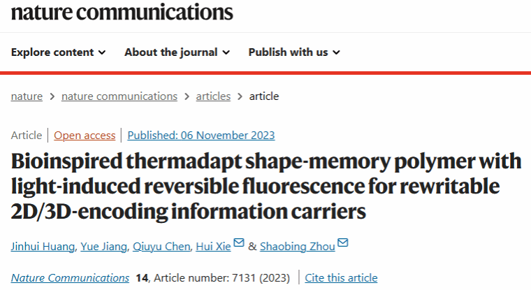 (生物医学工程研究院)周绍兵教授团队谢辉副教授在智能动态软材料研究中取得最新进展。谢辉副教授是我校软物质创新团队的骨干成员。相关研究成果以“Bioinspired thermadapt shape-memory polymer with light-induced reversible fluorescence for rewritable 2D/3D-encoding information carriers”为题,发表在国际综合性期刊《Nature Communications》上,论文的第一作者为老澳门六合彩-老澳门六合彩官网