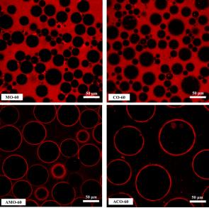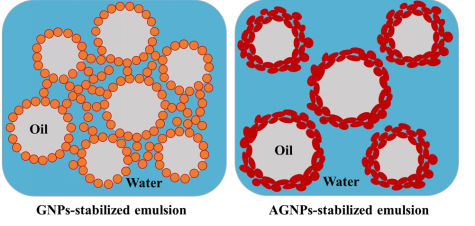 本文以氨基化改性明胶纳米颗粒(AGNPs)为稳定剂,以不同食用油(MCT油和玉米油)为内相,制备体积分数高达85%的O/W型Pickering乳液。以β-胡萝卜素为模型生物活性化合物,以实际应用为重点,研究了颗粒表面润湿性,油相类型和模型化合物的加入对所得Pickering乳液微观结构和性能的影响。与天然明胶纳米颗粒(GNP)相比,AGNPs具有更高的表面电荷、疏水性和可形变性。更重要的是,绝大多数AGNP倾向于不可逆地吸附在油−水界面形成独立油滴,而GNP倾向于在水相中聚集,捕获油滴形成三维网络。这证明了界面吸附是稳定Pickering乳液的首要因素。