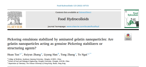 翁杰课题组谭欢副教授的研究成果《Pickering emulsions stabilized by aminated gelatin nanoparticles: Are gelatin nanoparticles acting as genuine Pickering stabilizers or structuring agents?》。本论文受到国家自然科学基金项目(21802009)、四川省科技厅基础应用研究项目(2018JY0611)以及中央高校基本科研业务费创新项目(2682020ZT93、2682021CX101)的资助。论文的第一作者和通讯作者为谭欢副教授,香港中文大学Ngai To教授为共同通讯作者。硕士研究生张瑞云也参与了部分工作。