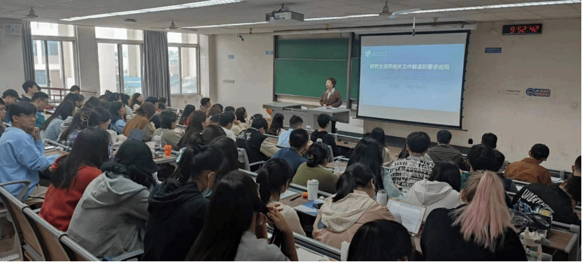 教务员刘柯宏老师为23级硕博同学解读研究生相关培养文件和要求,全体同学进一步明确了自己的毕业要求和未来的努力方向。