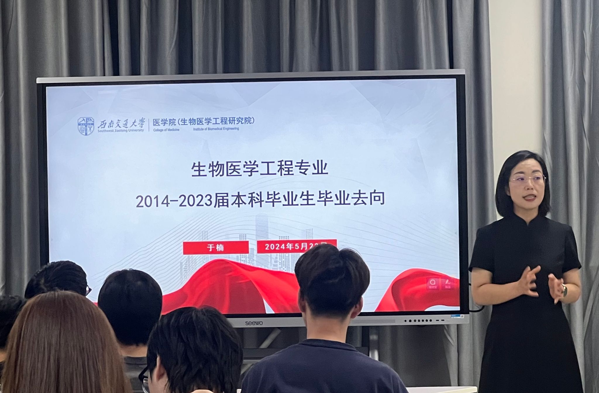 党委副书记于楠为同学们带来了生物医学工程专业近十年来的升学与就业情况分析。她通过详实的数据和案例,展示了生物医学工程专业毕业生在升学深造和就业市场上的优势和竞争力。于楠副书记还就当前就业市场的趋势和用人单位的需求进行了讲解,为同学们提供了宝贵的就业建议。