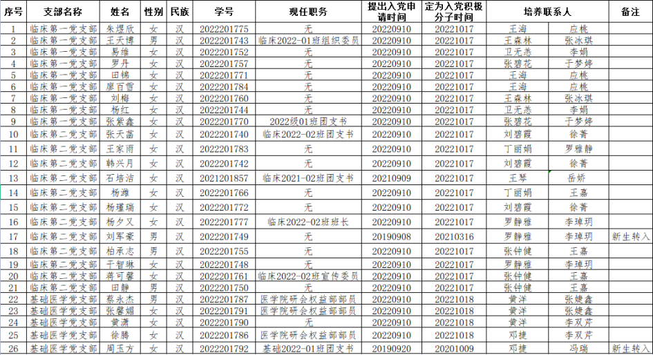 经学生本人递交入党申请书、党组织考察谈话、团支部推优或党员推荐、党支部委员会研究决定,现将老澳门六合彩官网 党委2022年第二批入党积极分子名单公示如下,公示期10月18日-10月24日,如有异议请以书面形式将意见反馈至老澳门六合彩官网 A209办公室。