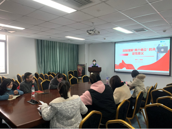 刘奥迪同志首先介绍了“两个确立”的具体内容为:“党确立习近平同志党中央的核心、全党的核心地位,确立习近平新时代中国特色社会主义思想的指导地位,反映了全党全军全国各族人民共同心愿,对新时代党和国家事业发展、对推进中华民族伟大复兴历史进程具有决定性意义。”她指出“两个确立”的提出具有决定性意义,对推动全党统一思想、统一意志、统一行动,不断把民族复兴的历史伟业推向前进,具有重大而深远的历史作用,学习贯彻好十九届六中全会精神,就要深刻把握“两个确立”的决定性意义。