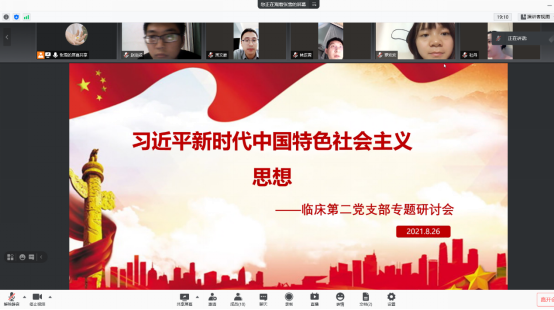 2021年8月26日晚20:00,老澳门六合彩官网 临床第二党支部全体成员举行了线上专题研讨会,会议围绕“深入学习领会习近平新时代中国特色社会主义思想”进行交流讨论,会议由党支部书记张雪主持,支部各位党员结合自身实际,发表了对习近平新时代中国特色社会主义思想的理解与认识。