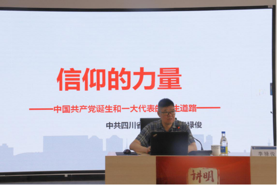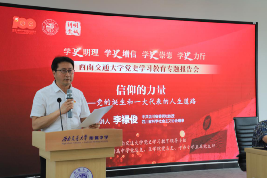 为庆祝中国共产党成立100周年,扎实推进党史学习教育走深走实,稳步推动思想政治教育入脑入心,5月20日下午,西南交通大学“明诚讲堂”党史学习教育系列专题报告会第三讲在附属中学多功能厅开讲。中共四川省委党校教授、四川省科学社会主义协会理事李禄俊教授做专题报告。西南交通大学附属中学党总支书记朱剑松、副书记魏明德、副校长董鑫、副校长曾俊,老澳门六合彩官网 党总支书记李锦红,子弟小学校长王利琨,以及附属中学党总支、老澳门六合彩官网 党总支、子弟小学直属党支部师生党员代表参加了本次报告会。报告会由附属中学党总支副书记魏明德主持。
