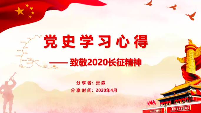 本次读书会上,张淼同志以PPT的形式分享了《中国共产党历史 第一卷》中关于红军长征的内容,并结合新型冠状病毒事件,致敬2020年疫情攻坚战中的长征精神。中国工农红军长征是人类历史上的伟大奇迹,历时两年,经过14个省,翻越18座大山,跨过24条大河,走过荒草地,翻过雪山,行程约二万五千里,这是一场关键的战略转移行动;长征的胜利使中国共产党有了稳固的革命根据地,使抗日战争、解放战争有了稳固的后方。长征是宣言书,它向全中国和全世界宣告,中国共产党及其领导的人民军队是一支不可战胜的力量;其铸就的伟大长征精神,是中国共产党人和人民军队革命风范的生动反映,是中华民族百折不挠、自强不息的民族精神的最高表现,是保证我们革命和建设事业走向胜利的强大精神力量。