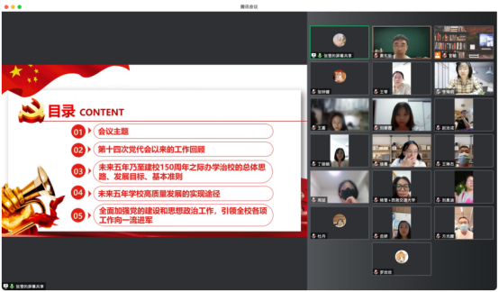 2022年9月22日晚8时,临床第二党支部通过腾讯会议于线上召开了本周的党支部集中学习会。本次学习会由支部书记张雪同志领学,全体党员参加,会议分为两个议程,第一个议程为学习西南交通大学第十五次党代会精神,第二个议程是支部工作法的学习与讨论。
