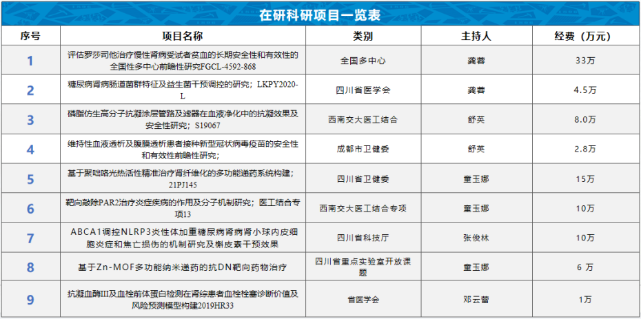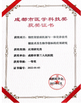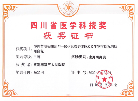 慢性肾脏病与腹膜透析课题成果分获2016、2022年成都市医学科技一等、二等奖、成都市科技进步三等奖、四川省医学科技三等奖。