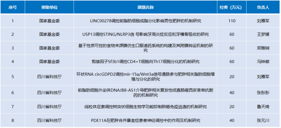 近年来,团队先后获得各类科研基金400多万元,其中国家自然科学基金5项,获得四川省医学科技奖三等奖(2项),四川省医学会优秀论文奖2项;获国家发明专利4项;在国内外学术刊物上发表论文200多篇,其中SCI收录论著100多篇;主编专著3部,参编10部。