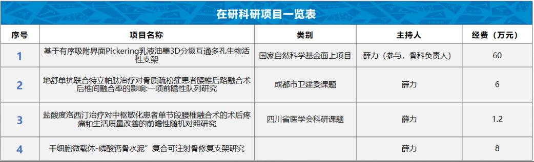 | 现任成都市第三人民医院骨科副主任、脊柱微创中心主任、成都市技术及学术带头人,四川省专家服务团专家,中国研究型医院学会脊柱外科分会腰椎学组椎间盘修复工作组成员;四川省医学会骨科专业委员会委员及脊柱微创学组委员;四川省中西医学会脊柱微创专委会委员及脊柱微创融合学组委员